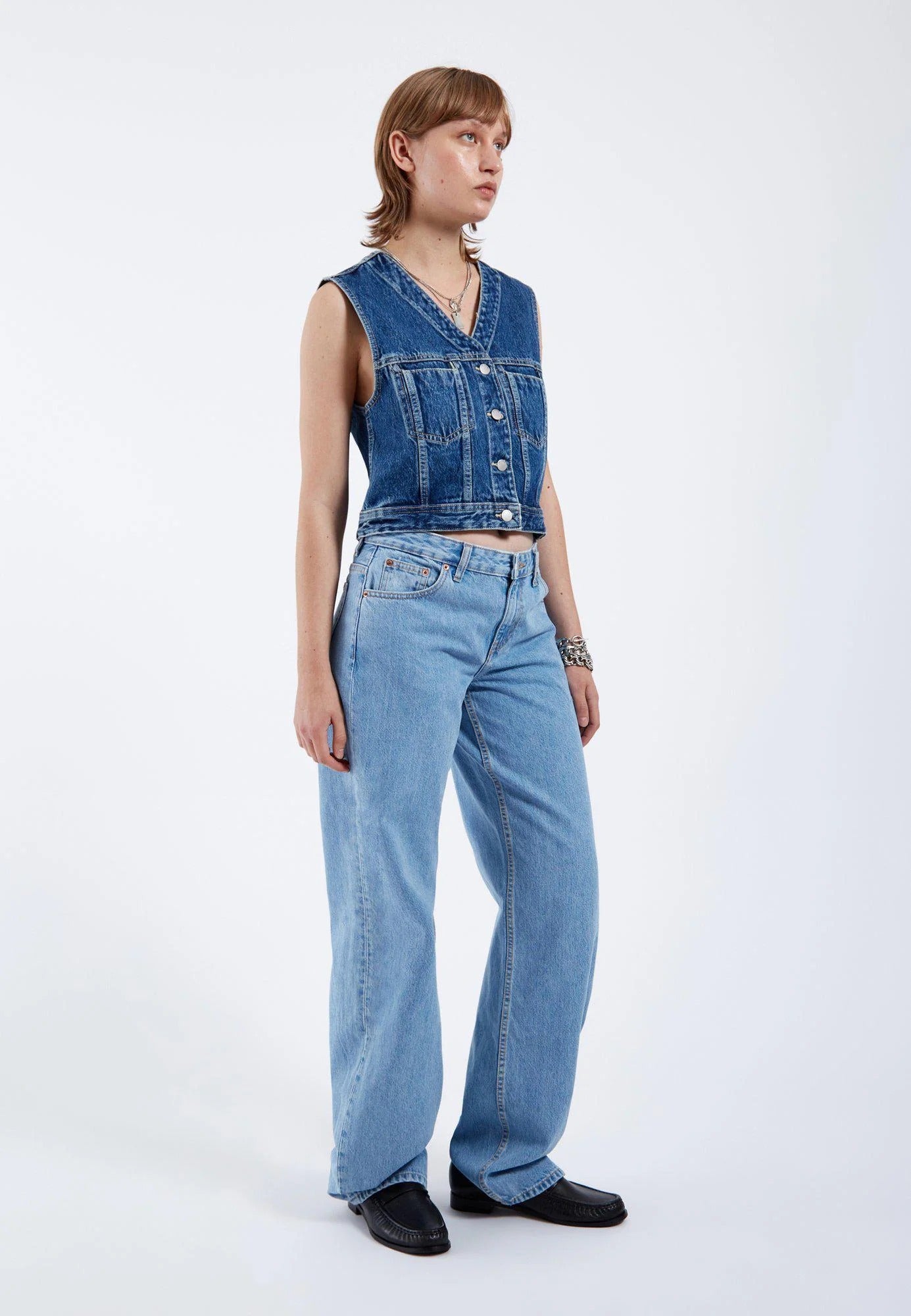 With a mid-waist fit and a wide straight line, it offers comfort and a relaxed style. The light blue color makes it easy to wear and ideal for casual everyday looks.